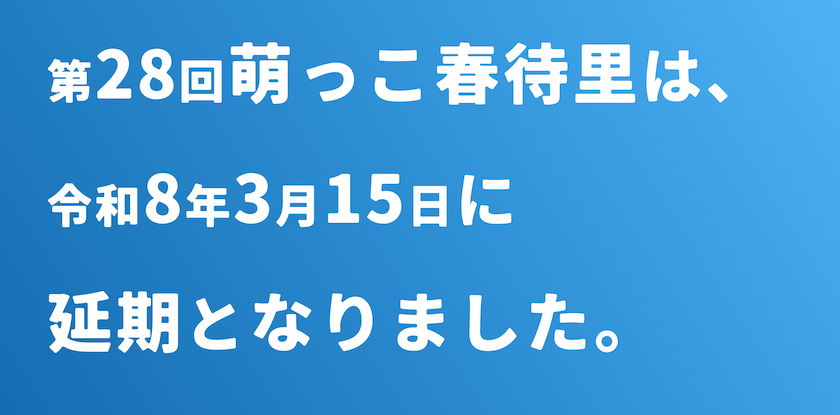 2021年、第23回萌っこ春待里は、残念ながら中止が決定いたしました。以下に、実行委員会からのお知らせを掲載します。